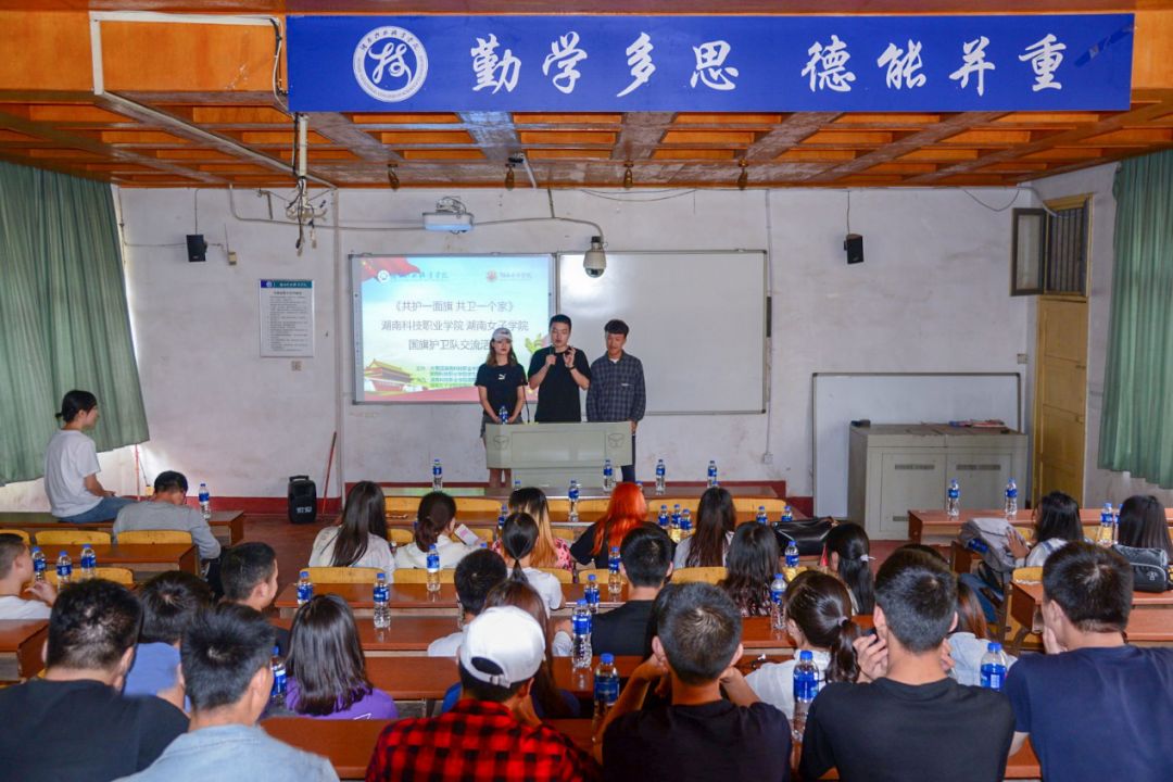 为了更好的促进我校国旗护卫队的建设,培养大学生尊重国旗、爱护国旗的意识,弘扬大学生爱国主义精神。我校国旗护卫队邀请湖南女子学院国旗护卫队于4月20 日开展了一场主题为“共护一面旗·共卫一个家”的交流活动,我校团委全体学生干部参加观摩活动。