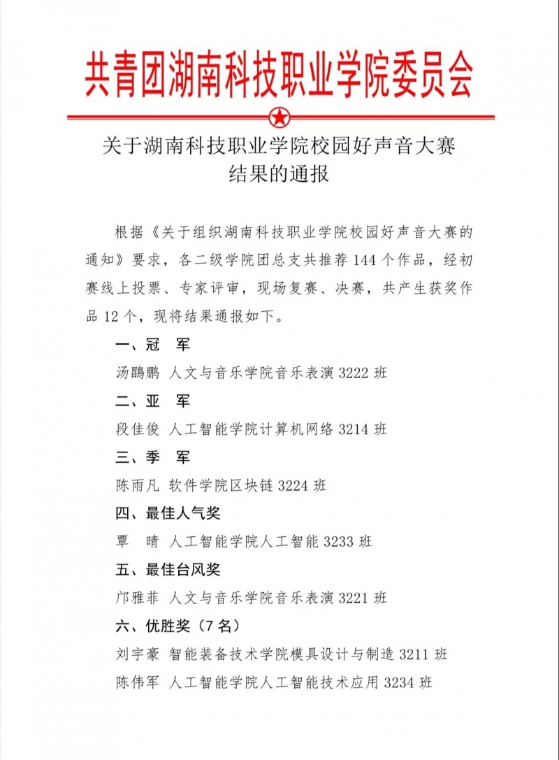 关于湖南科技职业学院校园好声音大赛结果的通报