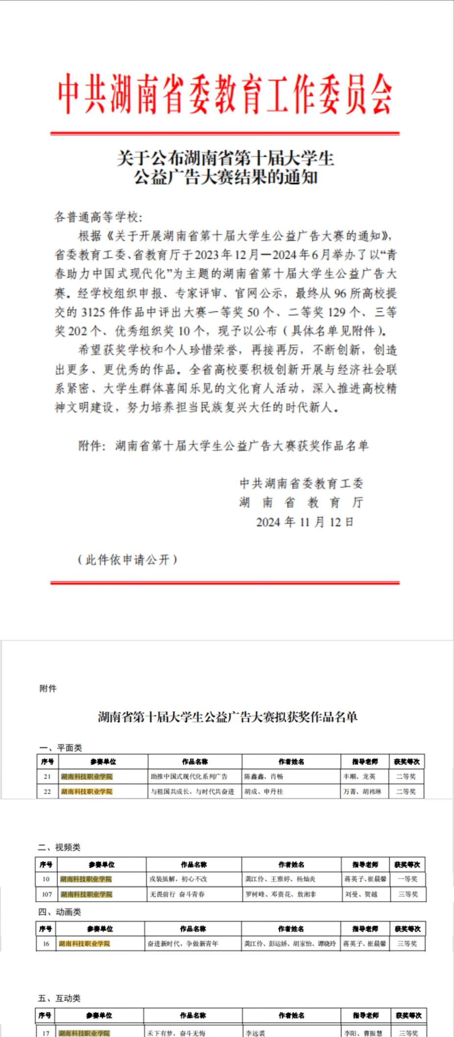 近日,由省委教育工委、省教育厅举办的湖南省第十届大学生公益广告大赛获奖结果公布,我校参赛作品《戎装虽解,初心不改》获视频类一等奖,《助推中国式现代化系列广告》《与祖国共成长,与时代共奋进》获平面类作品二等奖,《无畏前行 奋斗青春》《奋进新时代,,争做新青年》《禾下有梦,奋斗无悔》分别获视频类、动画类、互动类三等奖。争做新青年》《禾下有梦,奋斗无悔》分别获视频类、动画类、互动类三等奖。