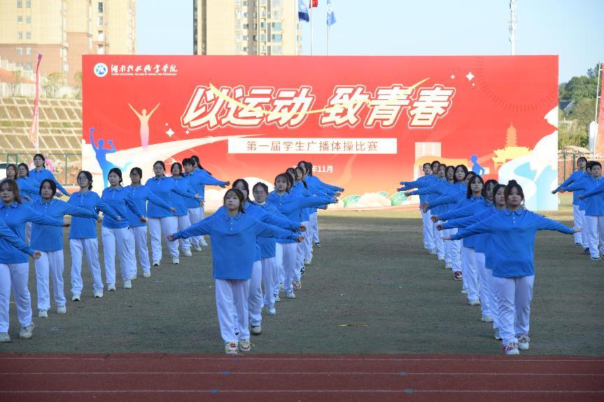 11月27日下午,我校第一届学生广播体操比赛在天心校区北院田径场成功举办。旨在更好地弘扬体育精神,丰富校园文化生活,展现我校学生的青春风采。学校党委书记杨翠明及分管校领导出席,相关部门及各二级学院相关负责人参加。党委委员、副校长彭波为本次比赛致辞,他鼓励同学们在比赛中积极拼搏,赛出风格。此次比赛以各二级学院为单位组队,每支队伍100人,在经过学院初赛选拔之后,7个二级学院的8支队伍共800余名师生参加决赛。