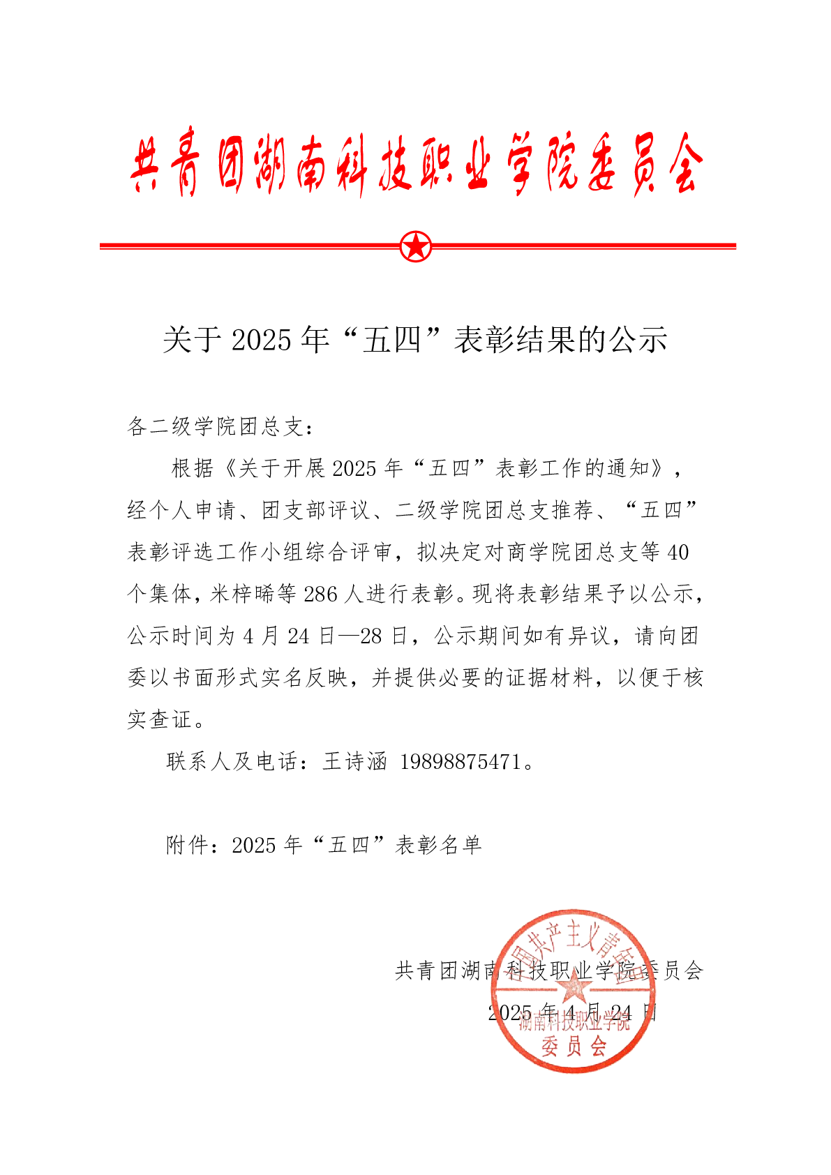 关于2025年 “五四” 表彰结果的公示