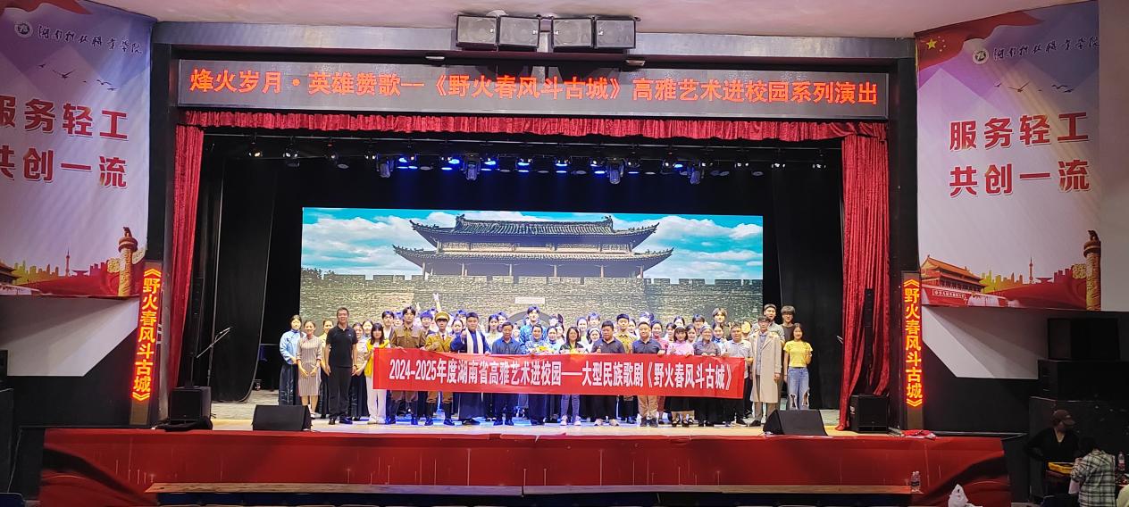 5月14日晚,湖南省高雅艺术进校园系列活动在学校雨花校区大礼堂盛大开启。此次活动由湖南省教育厅、湖南省委宣传部、湖南省财政厅和湖南省文旅厅联合主办,中南林业科技大学与我校共同承办。民族歌剧《野火春风斗古城》作为本次活动的重磅剧目,以独特的艺术魅力生动诠释红色基因,为全校师生呈上了一堂意义非凡的沉浸式“思政大课”。省教育厅体育卫生与艺术教育处一级主任科员张志敏,学校党委副书记邹海,党委委员、纪委书记王平,中南林业科技大学体育与音乐学院党委副书记钟楚鲲出席。学生工作部、团委,各二级学院党总支书记,师生代表700余人观看演出。